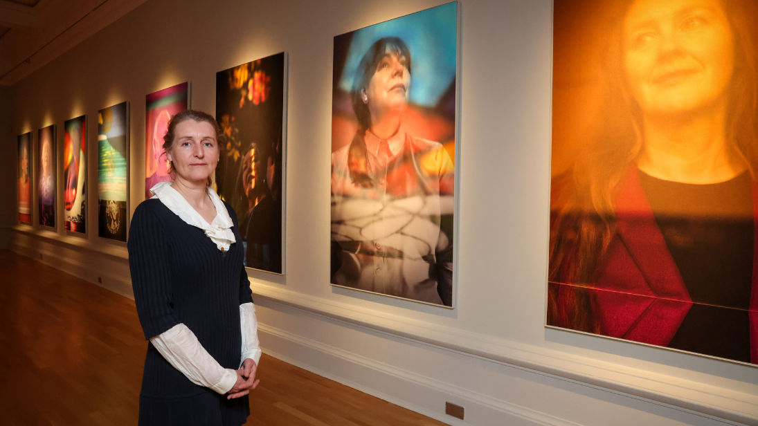 World-renowned, Belfast-born photographer Hannah Starkey pictured inside the gallery at Ulster Museum where large, colourful portraits of women who were influential to peace building in Northern Ireland are on display in a new exhibition.